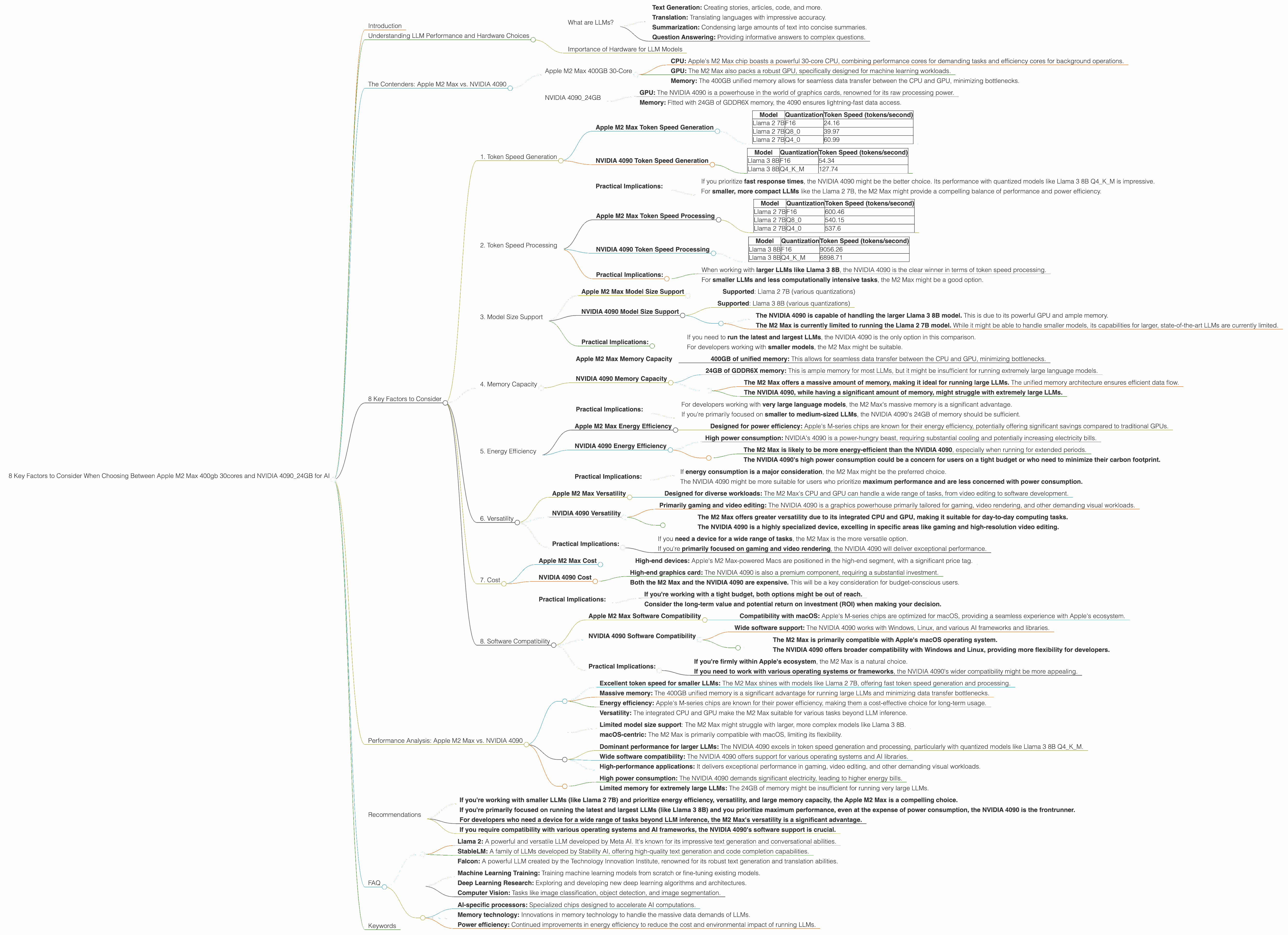 Now, let's dive into the key factors you should consider when choosing between the Apple M2 Max and the NVIDIA 4090 for running LLMs: