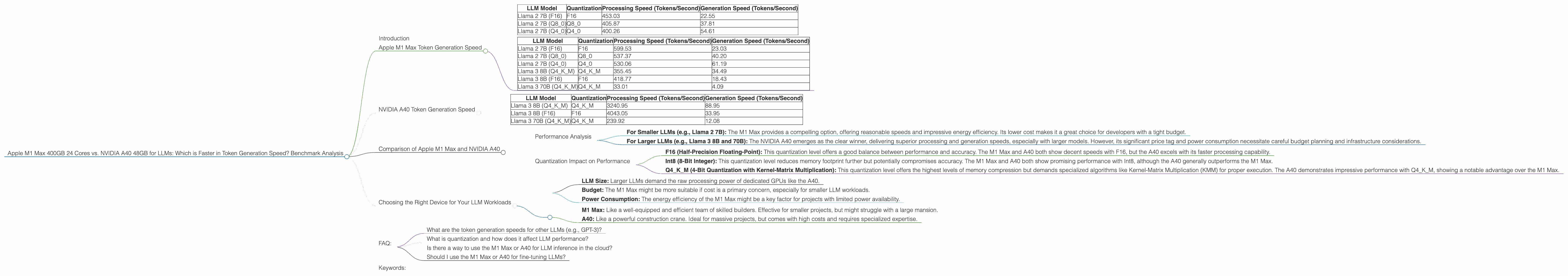 Apple M1 Max, NVIDIA A40, LLM, token generation, Llama 2, Llama 3, benchmark analysis, AI, GPU, performance comparison, quantization, F16, Q80, Q40, Q4KM, processing speed, generation speed, cloud computing, inference, fine-tuning.