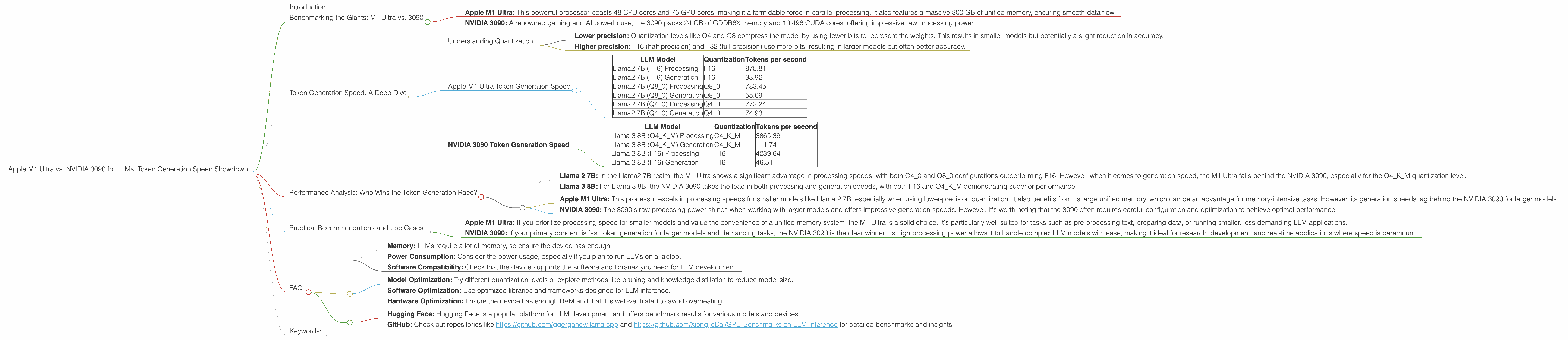 Apple M1 Ultra, NVIDIA 3090, LLM, Large Language Model, Token Generation, Token Speed, Benchmark, Performance, Llama 2, Llama 3, Quantization, F16, Q4, Q8, Processing Speed, Generation Speed, Use Cases, Recommendations, GPU, CPU, Software Optimization, Hardware Optimization, Hugging Face, GitHub