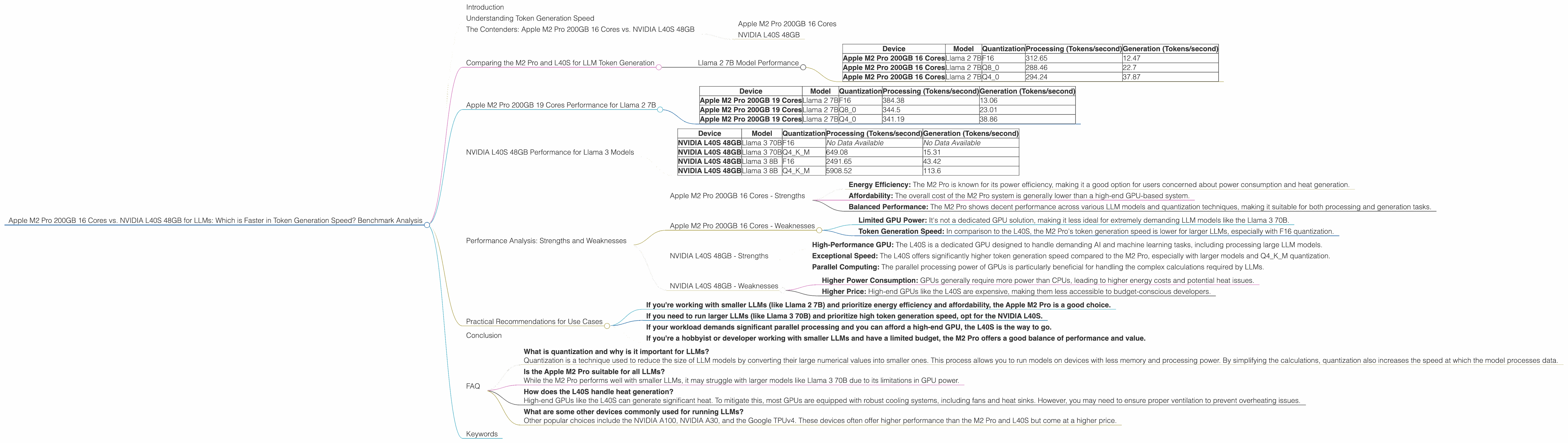 In this article, we’re diving deep into a head-to-head comparison of two popular choices for running LLMs: the Apple M2 Pro 200GB 16 core chip and the NVIDIA L40S 48GB GPU. We’ll analyze their performance in token generation speed for various LLM models and explore their strengths and weaknesses. This analysis will help you make an informed decision about which device best suits your needs for local LLM development or deployment.