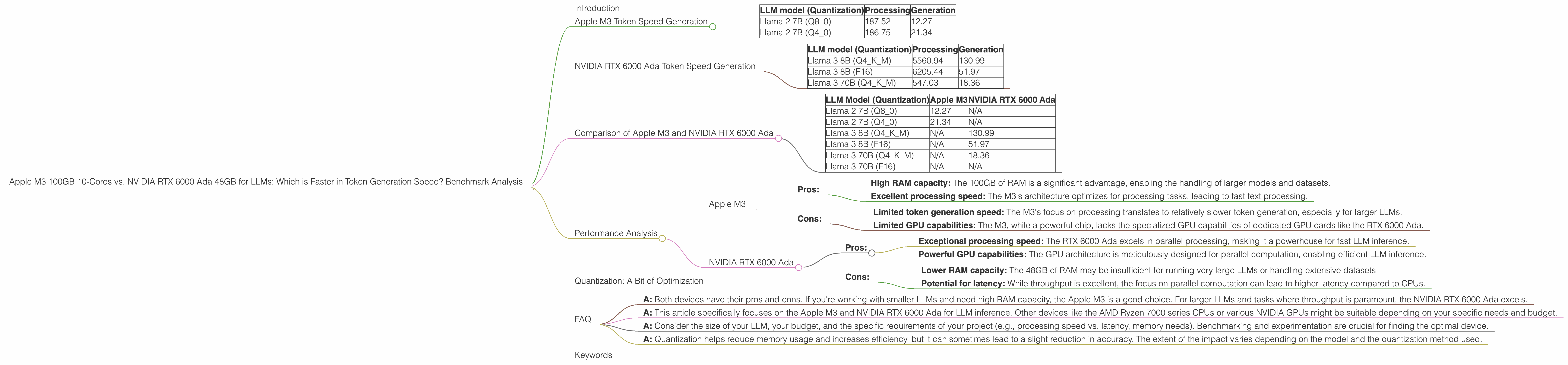 - A: Both devices have their pros and cons. If you're working with smaller LLMs and need high RAM capacity, the Apple M3 is a good choice. For larger LLMs and tasks where throughput is paramount, the NVIDIA RTX 6000 Ada excels.