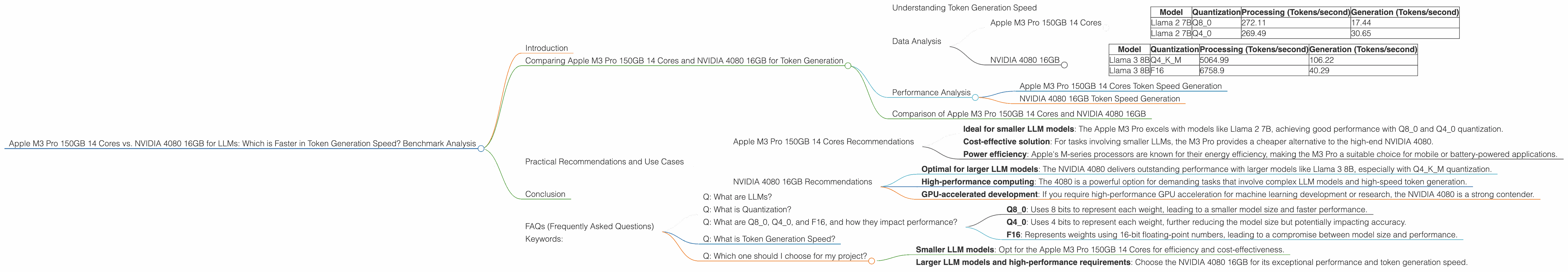 The choice between the Apple M3 Pro 150GB 14 Cores and NVIDIA 4080 16GB depends mainly on your specific needs and the type of LLMs you are working with. For smaller models and tasks requiring moderate token generation speed, the Apple M3 Pro offers a cost-effective and energy-efficient solution. However, for larger models and demanding applications requiring faster token generation, the NVIDIA 4080 shines with its powerful performance.