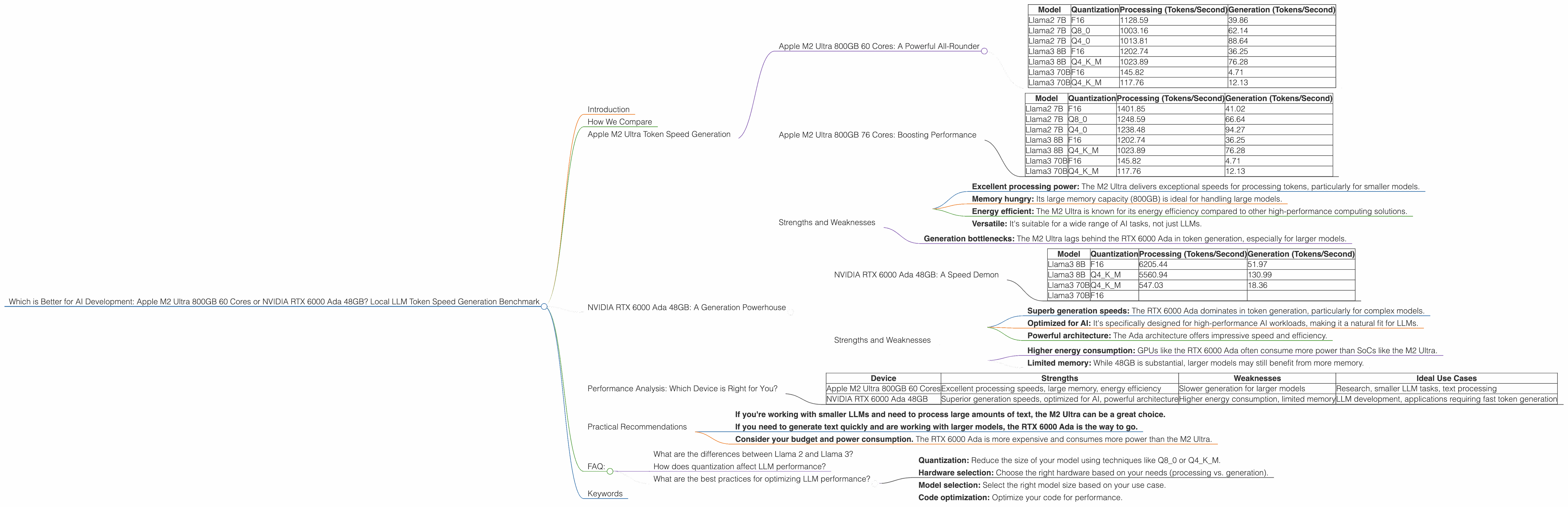Ultimately, the best choice for you depends on your specific needs. If processing speed and memory are your top priorities, the M2 Ultra is a solid option. However, if generating tokens quickly is critical, the RTX 6000 Ada is the clear winner for LLMs.