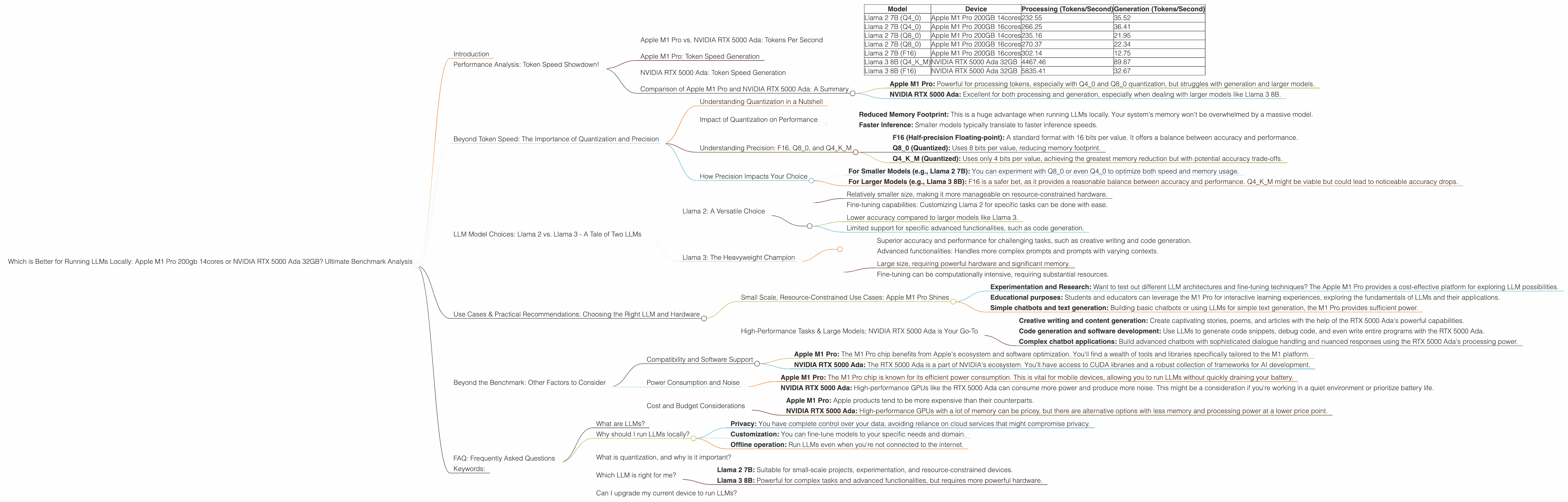 LLMs, large language models, Apple M1 Pro, NVIDIA RTX 5000 Ada, benchmark, token speed, processing, generation, quantization, precision, F16, Q80, Q4K_M, Llama 2, Llama 3, use cases, recommendations, compatibility, software support, power consumption, noise, cost, budget, FAQ, local execution, AI, deep learning, inference,
