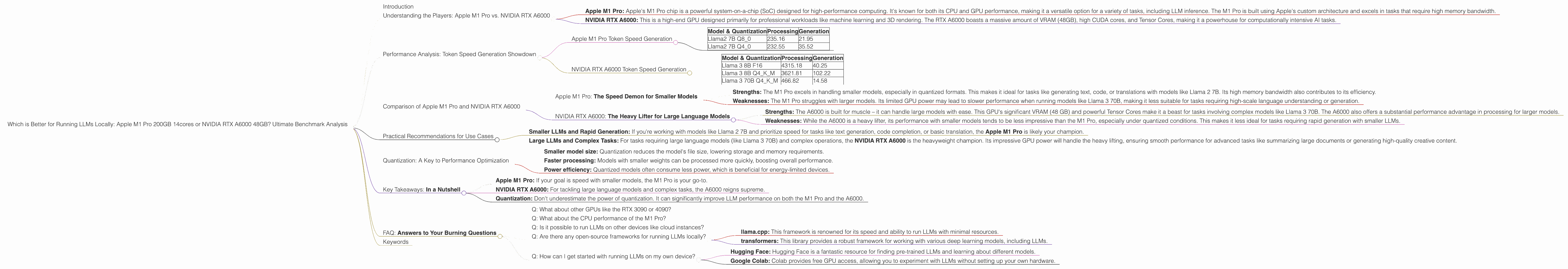 Apple M1 Pro, NVIDIA RTX A6000, LLM, Large Language Model, Token Speed, Generation, Processing, Llama 2, Llama 3, Quantization, Q8, Q4, F16, Benchmark, Performance Analysis, GPU, CPU, Memory Bandwidth, Use Cases, Recommendation, Open Source, Frameworks, llama.cpp, transformers, Hugging Face, Google Colab.