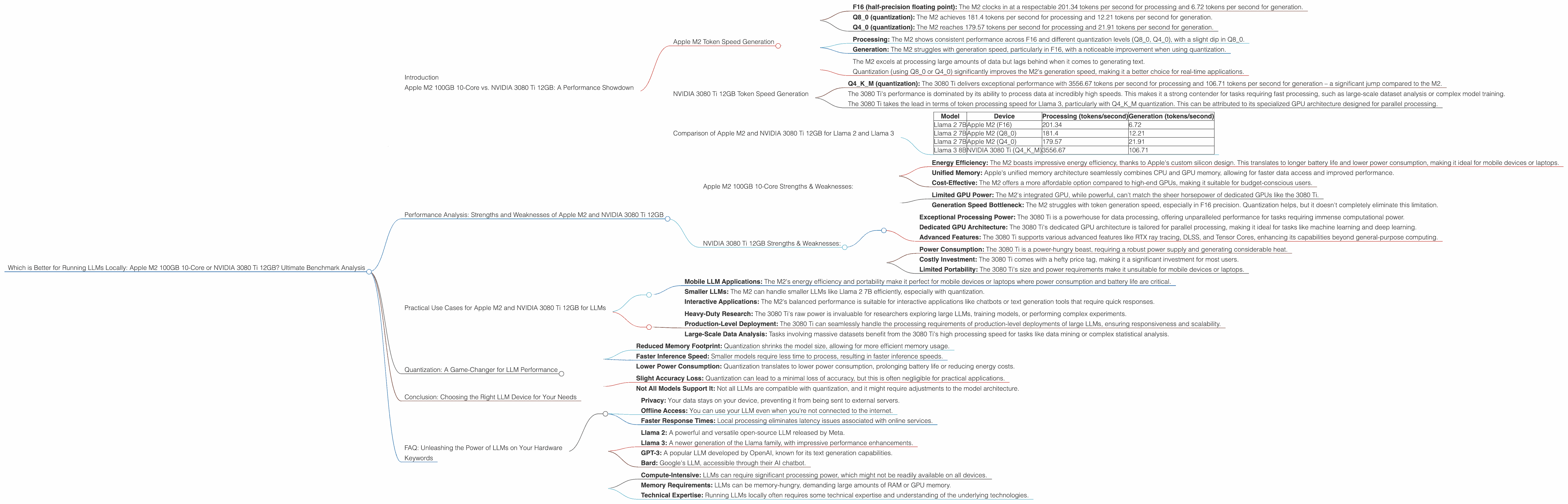 Apple M2, NVIDIA 3080 Ti 12GB, LLM, Large Language Model, Llama 2, Llama 3, Token Speed, Processing, Generation, Quantization, Performance, Comparison, Benchmark, Strengths, Weaknesses, Use Cases, GPU, CPU, GPU Cores, Memory, Energy Efficiency, Cost, FAQ, AI, ML, Deep Learning, Inference Speed, Accuracy Loss, Data Analysis, Research, Deployment, Mobile, Portability