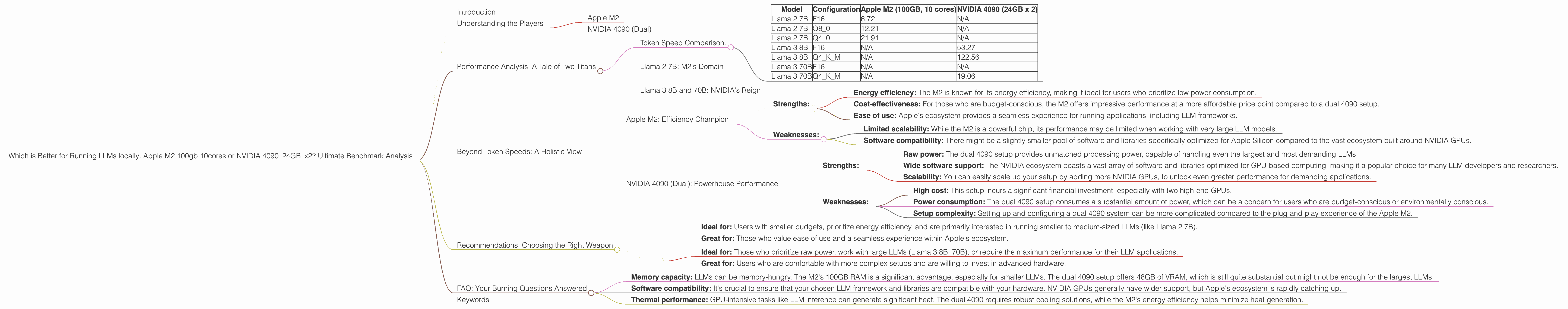 The world of large language models (LLMs) is rapidly evolving, with new models and techniques emerging constantly. While cloud-based solutions dominate the LLM landscape, running LLMs locally on your own machine offers several advantages: enhanced privacy, greater control, and potentially faster inference speeds. But choosing the right hardware can feel like a daunting task. Should you opt for the power of a high-end NVIDIA GPU or the efficiency of an Apple M2 chip? This article will dive deep into a head-to-head benchmark analysis of the Apple M2 (100GB, 10 cores) vs. the dual NVIDIA 4090 (24GB each) for running LLMs locally. We'll analyze the performance of these setups across various popular LLM models and explore their strengths and weaknesses.