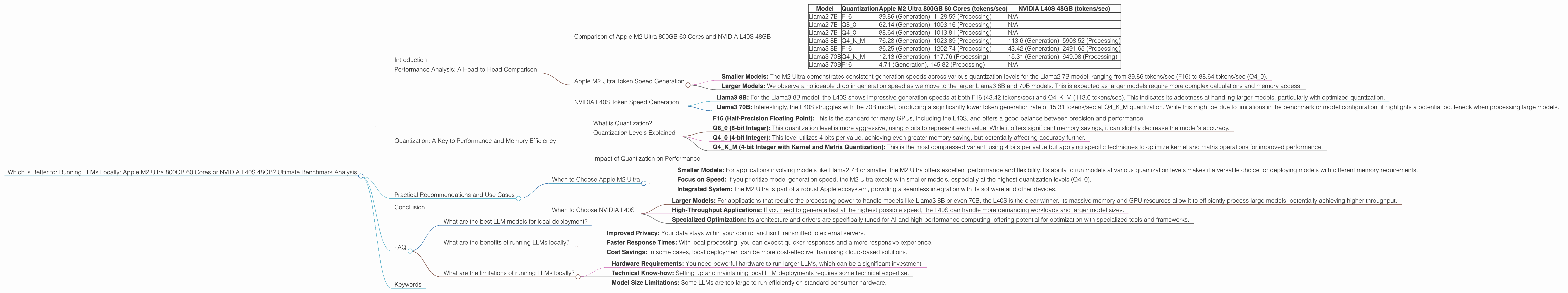Choosing the right device for running LLMs locally is a crucial decision that impacts both performance and cost. Both the Apple M2 Ultra 800GB 60 Cores and NVIDIA L40S 48GB offer compelling advantages for different use cases. The M2 Ultra shines in its ability to handle smaller models with high efficiency across various quantization levels, while the L40S emerges as the powerhouse for processing larger models with impressive speed. Ultimately, the best choice depends on your specific requirements, model size, and desired performance. With this detailed analysis, you have the tools to make an informed decision and unleash the full potential of your local LLM deployments.