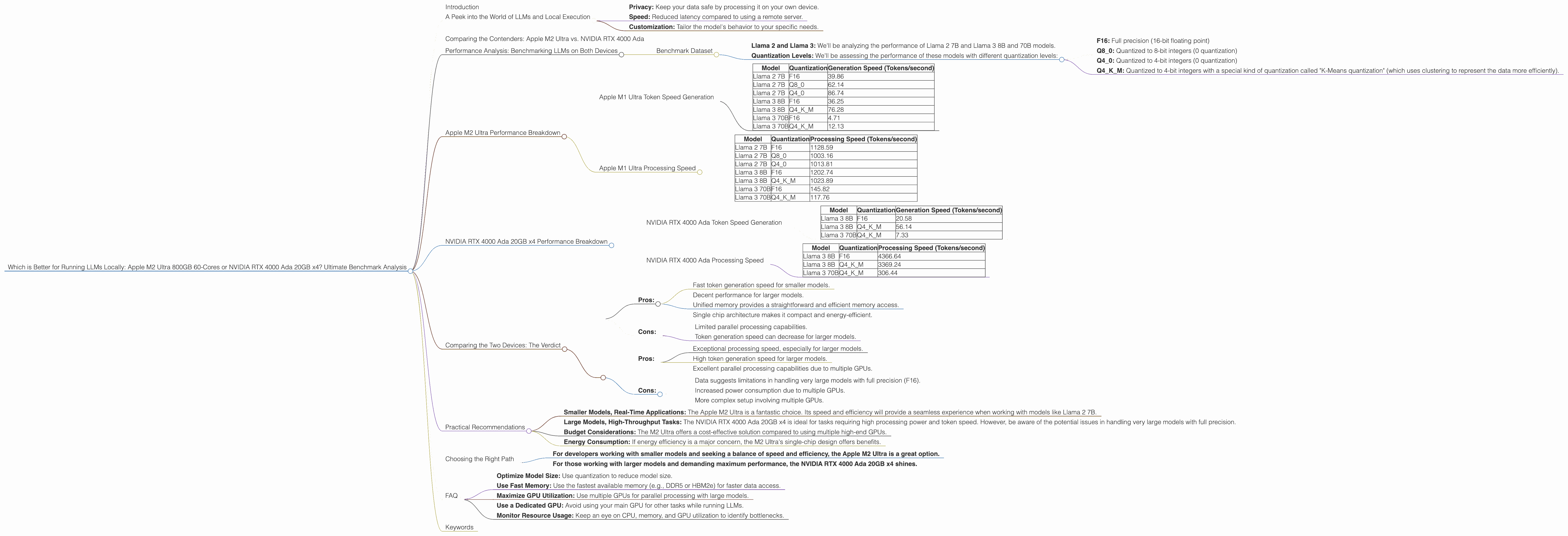 LLM, large language models, Apple M2 Ultra, NVIDIA RTX 4000 Ada, GPU, CPU, token generation speed, processing speed, quantization, F16, Q80, Q40, Q4KM, Llama 2, Llama 3, benchmark, performance, local execution, inference, parallel processing, AI, artificial intelligence, machine learning, deep learning, developer, geek, geeky, conversational, comparison, analysis, recommendations, best practices, budget, energy consumption, power consumption.