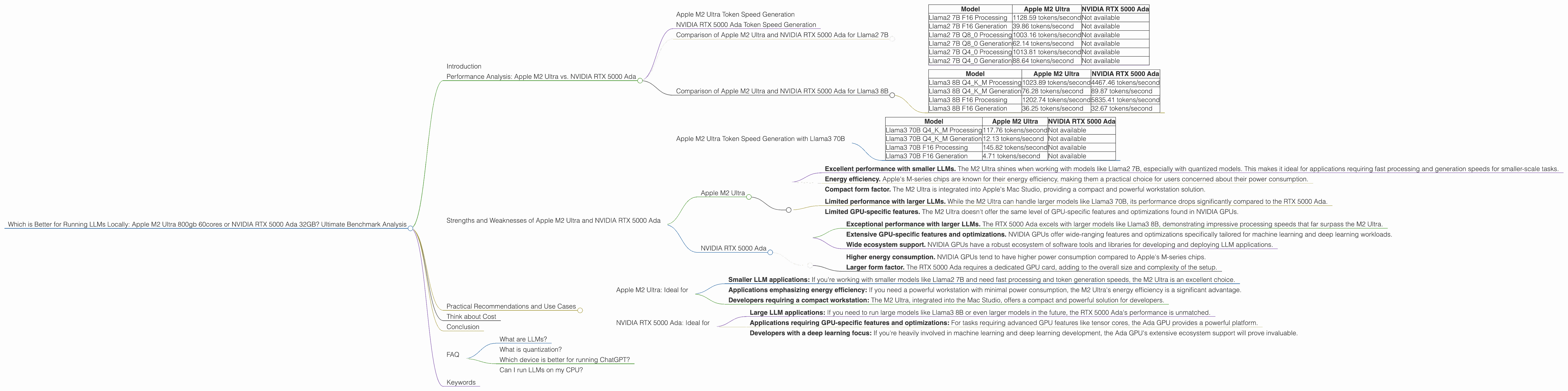 Choosing between the Apple M2 Ultra and the NVIDIA RTX 5000 Ada for running LLMs locally ultimately depends on your specific needs and priorities. If you're working with smaller models and prioritize energy efficiency and a compact form factor, the M2 Ultra is an excellent choice. But if you're dealing with larger LLMs and need the raw performance of a dedicated GPU, the RTX 5000 Ada is the clear winner.