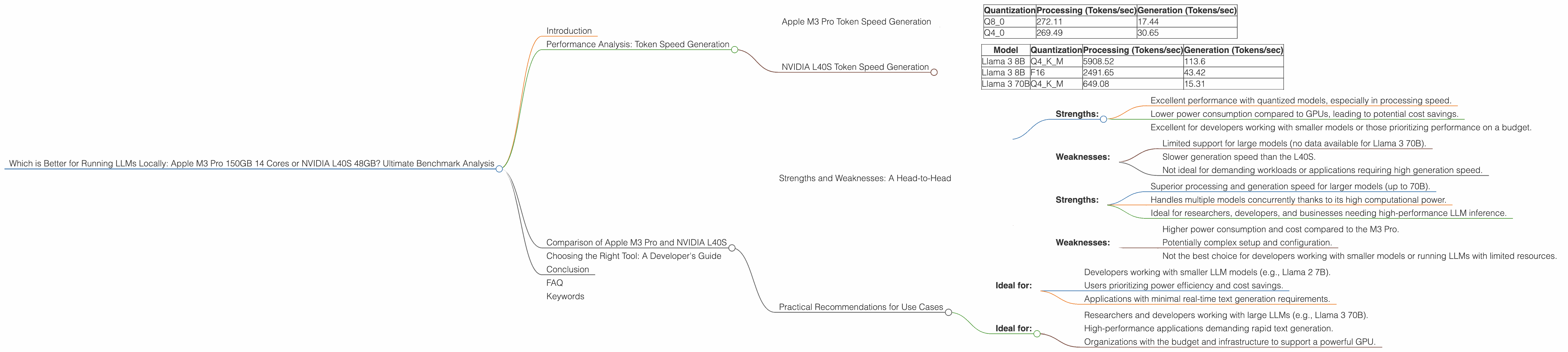 Apple M3 Pro, NVIDIA L40S, LLM, Large Language Model, Llama 2, Llama 3, Token Speed, Quantization, Inference, Performance, Benchmark, Local, AI, Machine Learning, Developer, GPU, CPU, Cost, Power Consumption, Use Cases, Comparison.